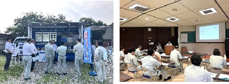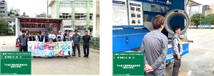 | 内 容 | 下水道課だけではなく、上水道課の担当の方にも出席頂きました。 座学に加え、キャラバンカー搭載の実物サンプルを用いた説明で、工法をより理解することができたと、ご好評を頂きました。 |