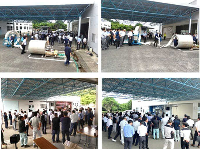 | 内 容 | 来年度からストックマネジメントにより更生工事を計画中とのこと。小口径の陶管の更生が多いとのことですが、浄化センター周辺には大口径の管もあり、EX工法およびダンビー工法の効果的なPRができました。 また、役所の方々から、熱心に、ご質問を多数いただきました。 |